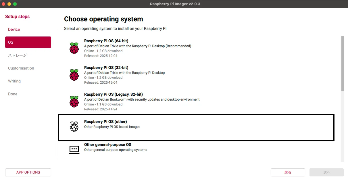 アプリを起動し、利用するラズパイのモデルを選択。