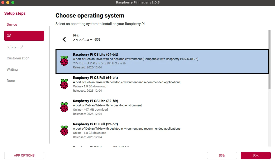今回は、ターミナル操作がメインなので、「Raspberry Pi OS (other)」 → 「Raspberry Pi OS Lite(64-bit)」を選択。