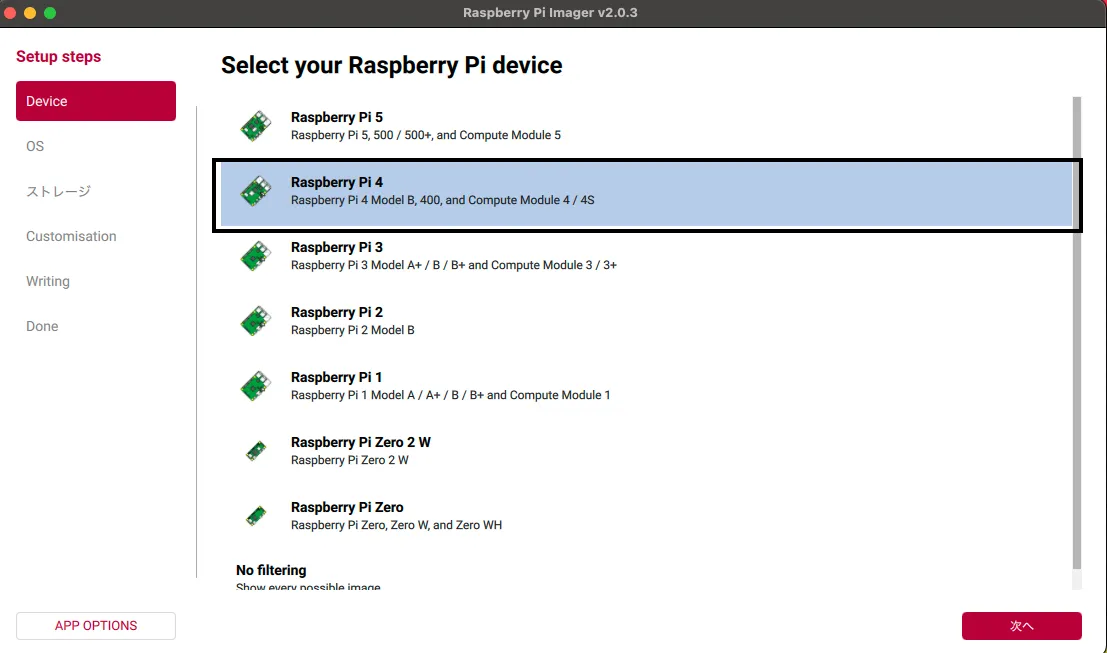 アプリを起動し、利用するラズパイのモデルを選択。
